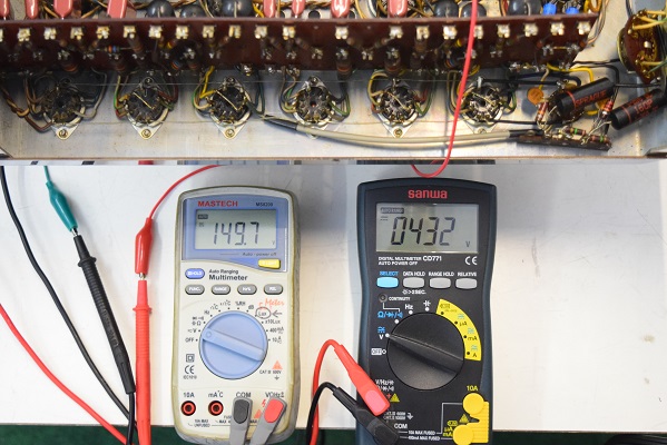 この画像の右のテスターは高圧B1,2の値です。432Vを示し良好です。左の白いテスターはバイアスC電圧です。-149.7Vを示し良好です。