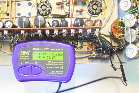こちらは初段のカソードバイパスコンです。左右とも劣化して不良です。