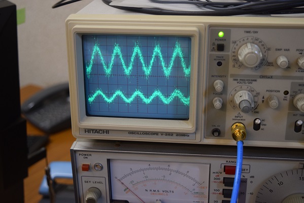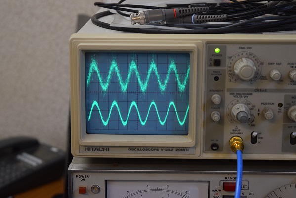 オシロの上段は右側出力で下段が左出力です。少し波形が乱れています。
