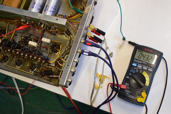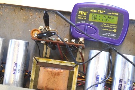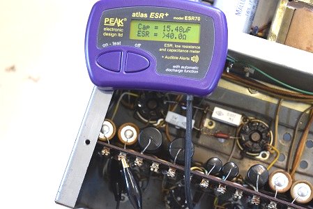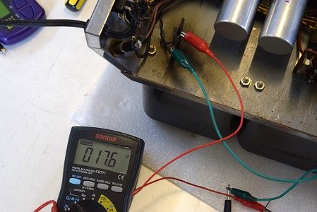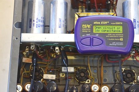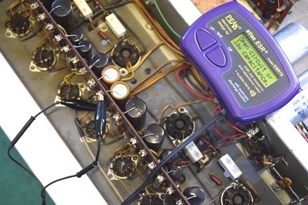 こちらは左出力管バイアス系統のコンデンサーですがESRが計測最大値40.0Ω超えを表示しています。