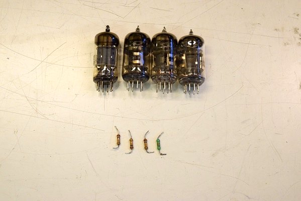 交換部品です。ドライブ管の一部に中国製が使われていました。しかもその中に真空管試験機で測定すると既に限界値を下回る物もあったので怪しいものは良品と交換しました。