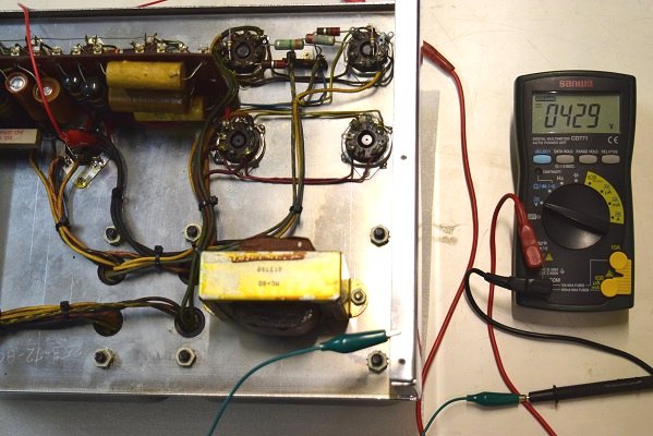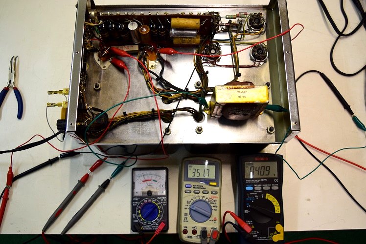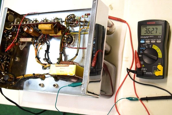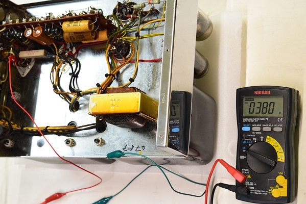 高圧B1です。451Vを示し良い値です。電圧は良いのですが電解ブロックコンデンサーが殆ど機能していないので恐らく電圧にリプルが乗って音にも影響が出ていると推測します。