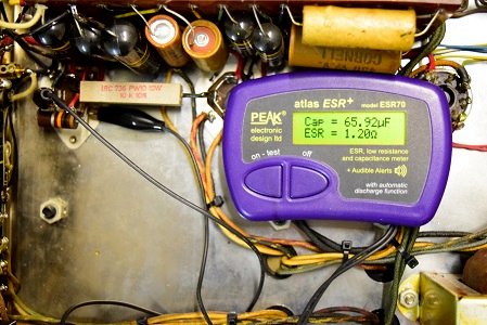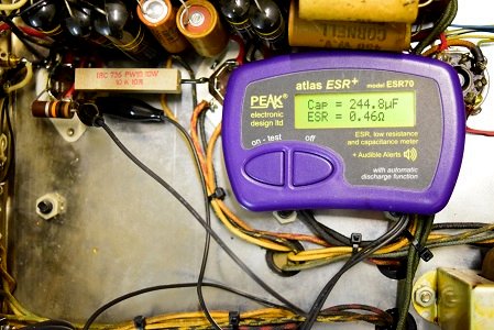 初段管のカソードバイパスコンです。容量が倍に膨らみESRも高い状態です。