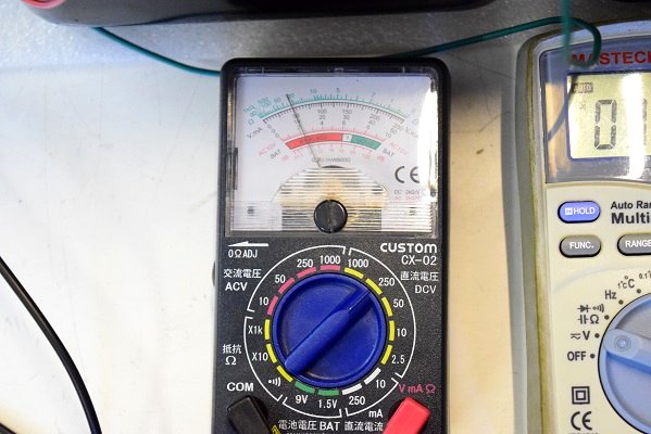 右のテスターは高圧B1です。430Vを示し良好です。中央のテスターは高圧B2です。367Vを示し良好です。