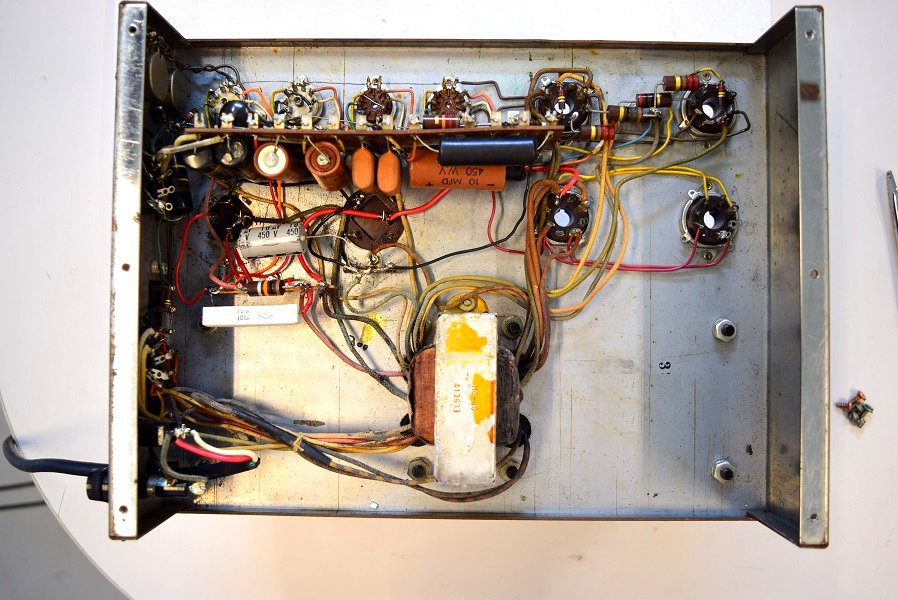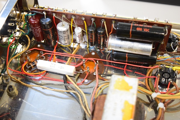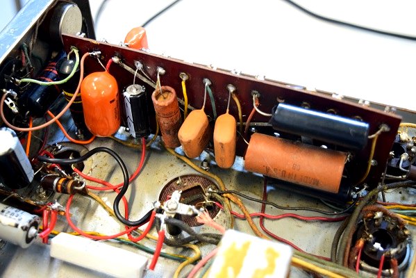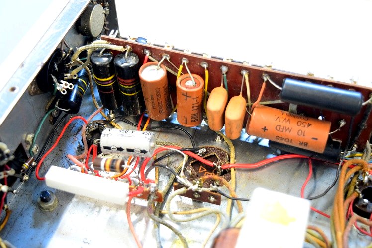 以前どこかで国産のコンデンサーや手に入りやすいコンデンサーでレストアされています。それでも直らなかったのか、外観も酷いので諦めて放置されたようです。