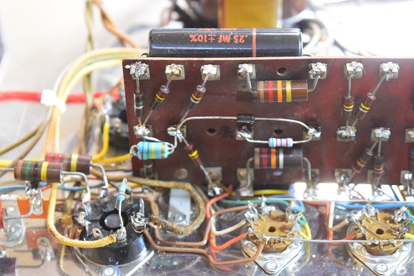 各臓物の消耗品類は後で全て交換になります。真空管ソケットも既に交換されているものもありますがビス止めです。当工房では全てのソケットを純正品に交換し、取り付けはオリジナルと同じリベット止めになります。