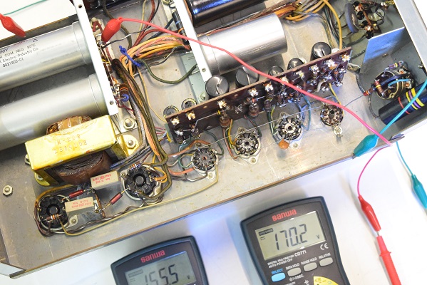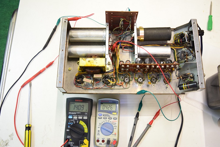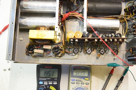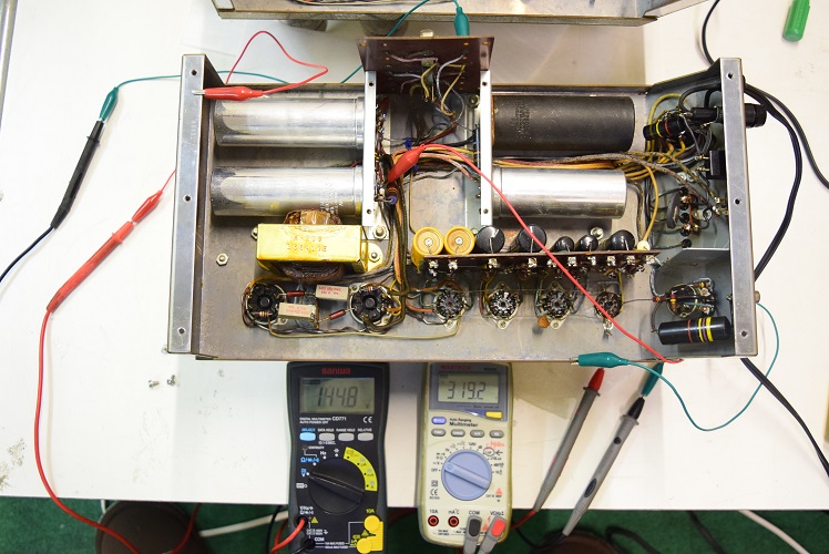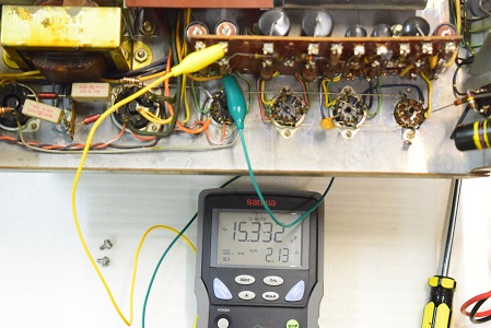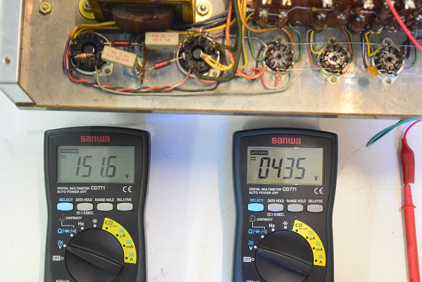 左テスターはバイアス電圧で-151.6Vを示し良好です。右テスターは高圧B1です。435Vを示し良好です。