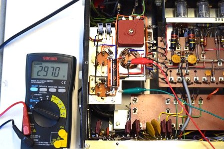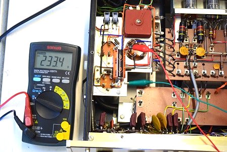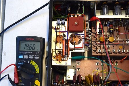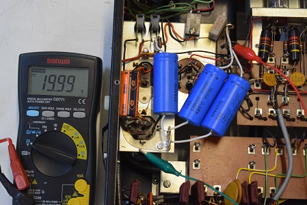 低圧のヒーター電圧です。19.99Vです。ブリッジダイオードユニットと追加された別回路の電解コンデンサーの効果で良い値です。