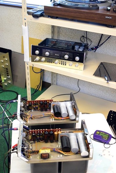 ← 左の画像はただ今レストアを行っている別のオーナーの方のMcIntosh MC40に繋いでエージングを行っている風景です。