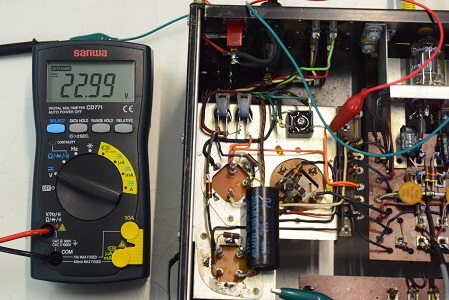 低圧整流ブリッジダイオード直後の電圧です。22.99Vとこちらもかなり低い値です。半年前は26.19Vで良い値でした。