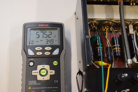 最初の検査でチェックしなかった最終段出力コンデンサー バンブルビー0.022uFの片側の足を外して単体チェックを行っています。左右ともOL表示で完全良品です。