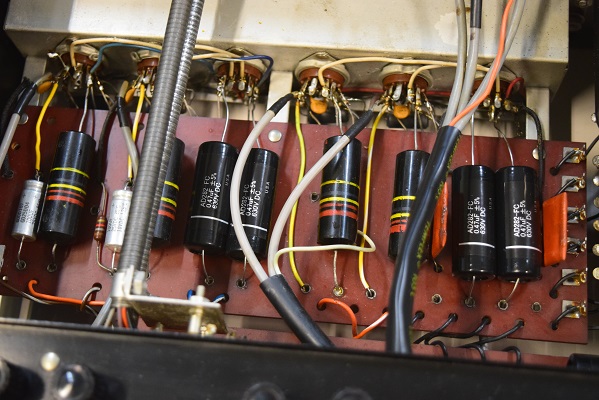 電源回路は以前他のレストア屋さんがご苦労されて抜けているブロックコンデンサーに市販の電解コンデンサーをパラに接続されました。しかし、電圧は確保されたものの抜けたブロックコンデンサーをそのまま使用されているのでこの影響から追加された電解コンデンサーの能力が発揮できず、少し脈流が乗った状態のB電圧が各回路に供給され、ノイズとなって音に乗ってきています。