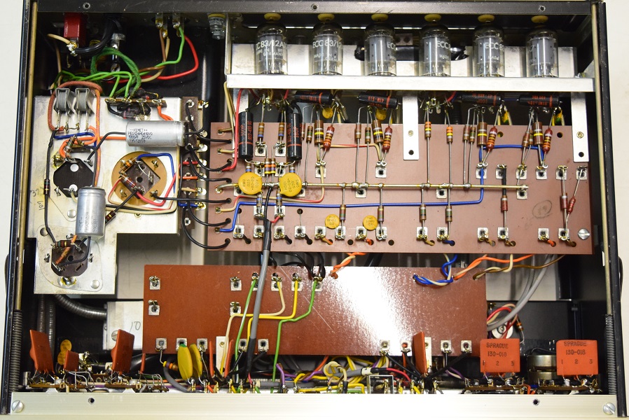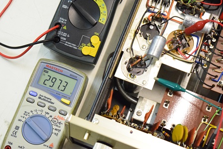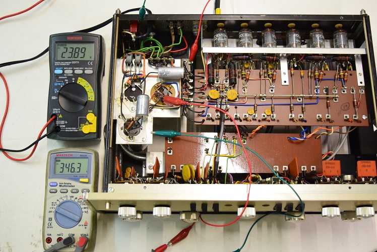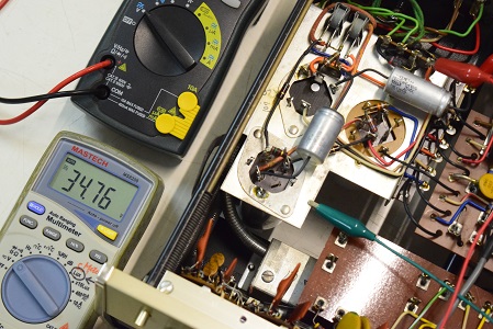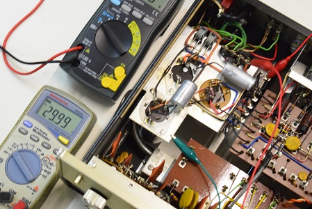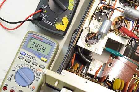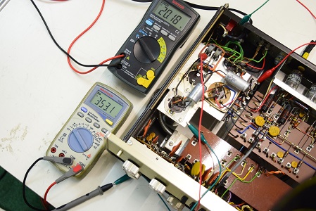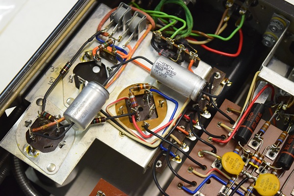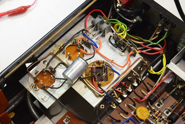 今回の修理は主に電源廻りです。電源トランスを特注品に換え、電解ブロックコンデンサーも高圧の2本をオリジナル仕様の新品に交換しました。