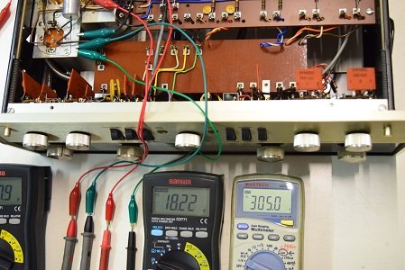 左のテスターは高圧セレン直後の電圧です。348.2Vを示し良好です。中央のテスターはヒーター電圧です。18.24Vを示し良好です。右の白いテスターは高圧です。詳細を以下に示します。