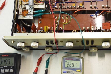 下の白いテスターは高圧セレン直後の電圧です。353.1Vを示し、やはり少し高い値です。