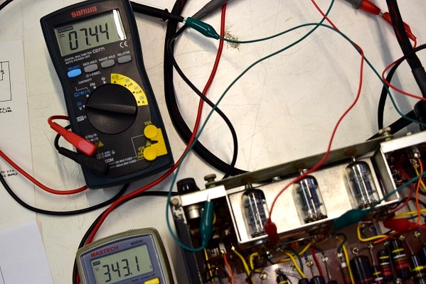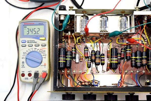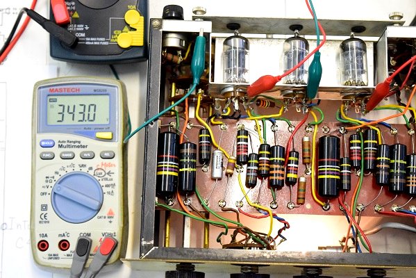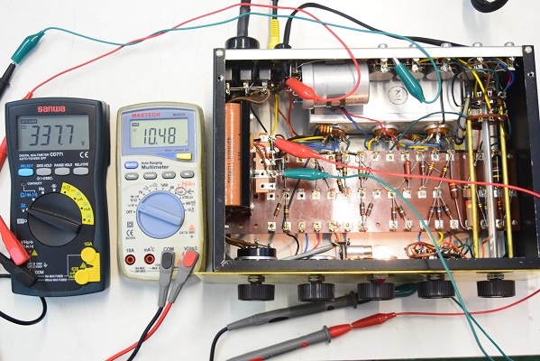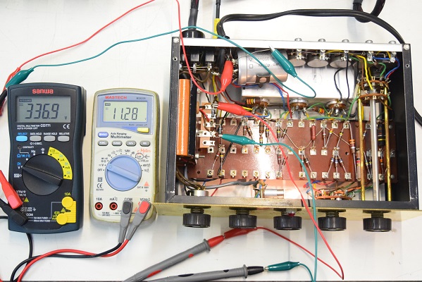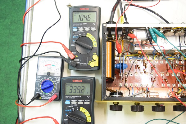 各電圧です。左の黒いテスターは高圧電圧です。337.7Vと良い値です。少し時間を置いて計っているのでこの値で安定しています。右の白いテスターがヒーター電圧です。10.48Vと既定に近い値です。