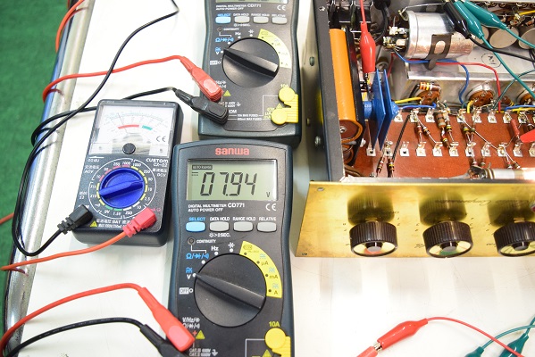 上のテスターはヒーター電圧です。こちらも換えていないので低い値です。8Vを示していますが時間が経つともう少し上がります。