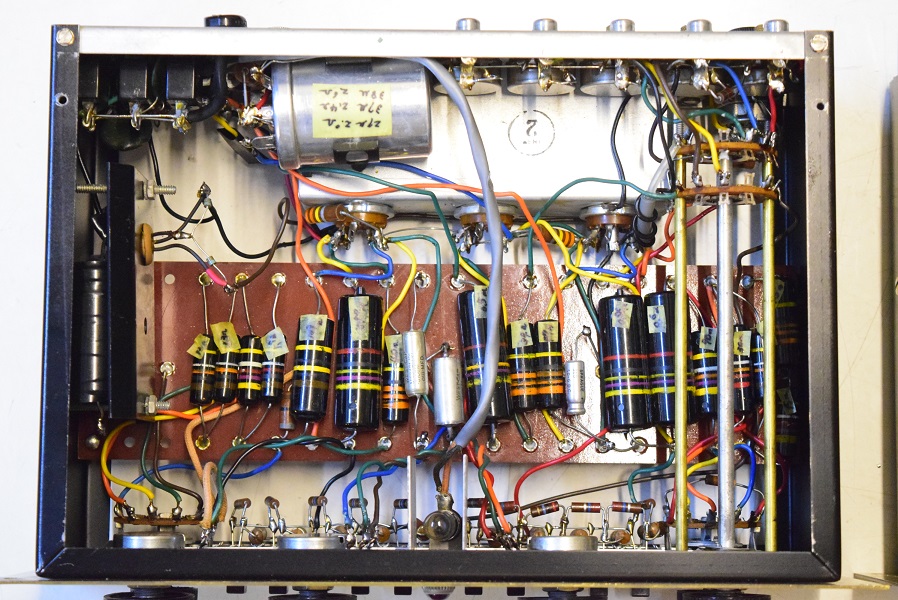 ヒーター回路のダイオードや使用していないセレンは撤去し、新規にラグ板に新しいダイオードを組み、左右違った形状のコンデンサーを両アンプとも新しいものに統一しました。
