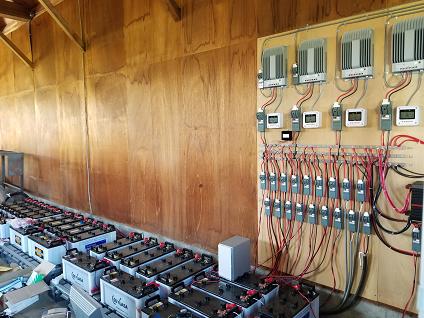 こちらの「サンライズ発電所音楽堂」の10kw自家発電システムでは太陽光発電からバッテリーに蓄電し、正弦波インバーターで交流出力を出しています。