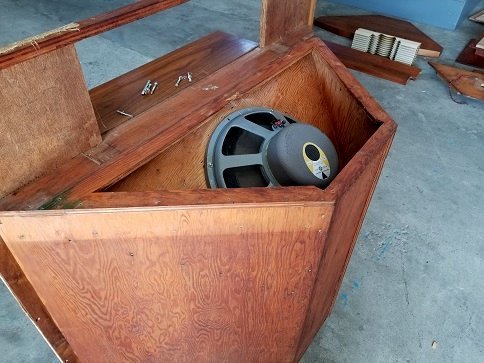 最初期、初期型はウーハーが上から斜めに取り付けられています。その下のエンクロージャーの中はかなり複雑な構造で、完全にボンドと釘で固めて分解不可能です。この為、当時から図面は無くオリジナルを壊すわけにも行かないのでコピーはなかなかできないそうです。