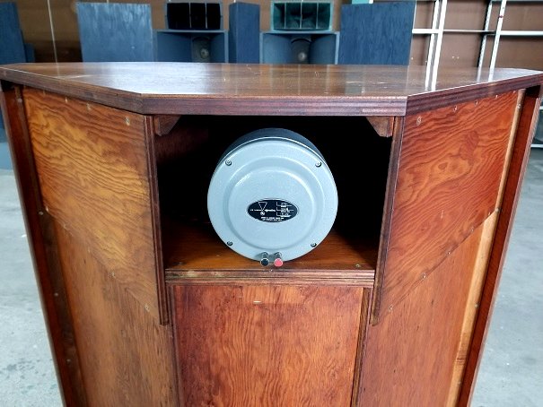 ★最初期型のエンブレムはシルク印刷、初期型はJBLのロゴが入ったバッジの形状ですが、最初期型の中にはまだエンブレムを付けなかった時期のものが極少であるそうです。ユニットやホーンの取り付けにも特徴があり、本機が正にこれに該当します。極めてレアな機種になります。
