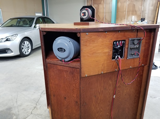 ジムランの最初期型ではツイーターを箱の中に埋め込むことができません。この為、別置きで上に乗せています。