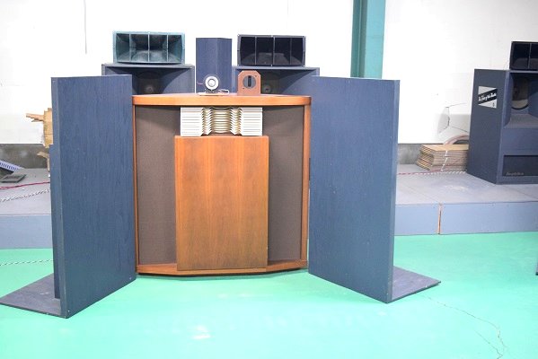 反面、バッフル板を外されたALTEC A-7は羽を取られた蝶の様に全く響きもしなくなりました。やはりA-5, A-7はバッフル板が無ければまともな音にはならないようです。しかも、よくある平面バッフルでは効果が薄く、こちらの様に開口部に角度を付けられれば、いわゆるコンプレッション効果で音の迫力が増します。これで少し離れて聴けば空間そのものが楽器の感覚で、よりダイナミックな音が聴けます。
