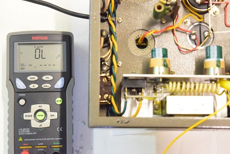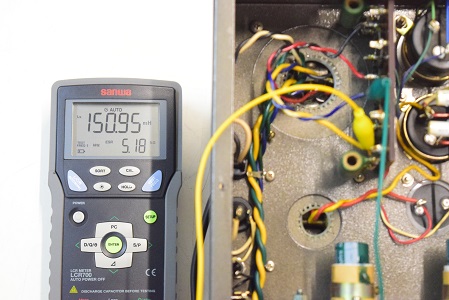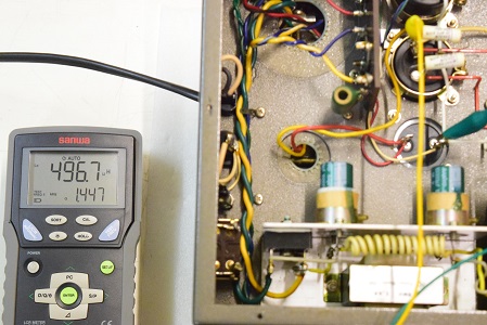 ★全体に良い状態ですが気になる点は、異音の出る方の高圧用チョークトランスのインダクタンスがもう片方より1.5倍に膨らんでいることです。整流後の先頭に位置する為まだリプルが乗り、振動を起こしているかも知れません。