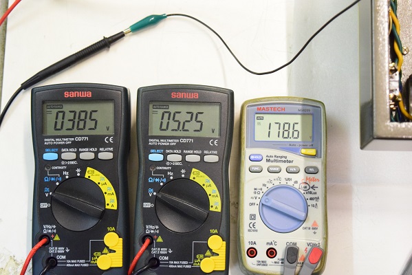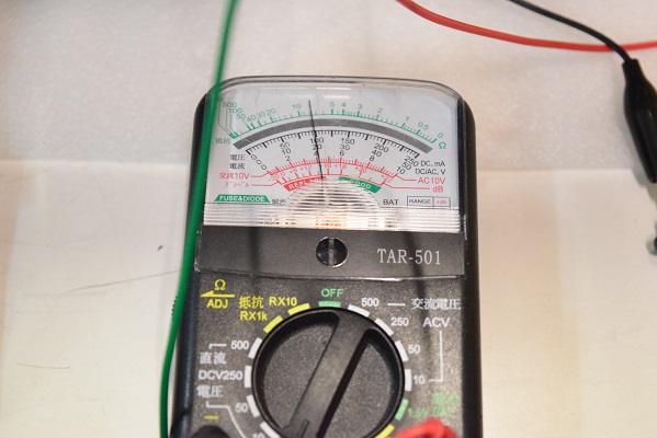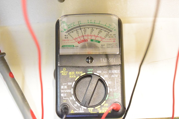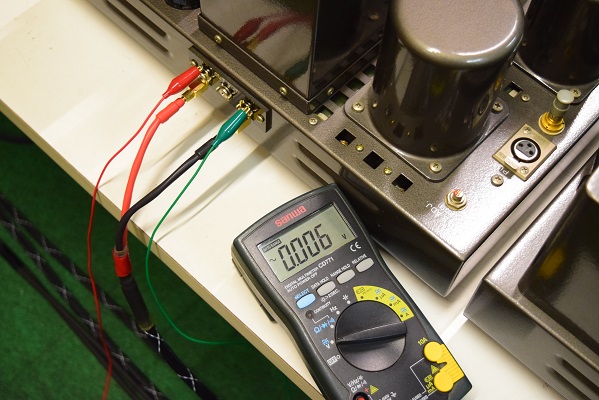 こちらはノイズが出ない方のアンプですが、実際にはブーンとジーが混ざったノイズが出ています。画像のテスターでは AC 0.006Vを表示して明らかにノイズが検出されます。