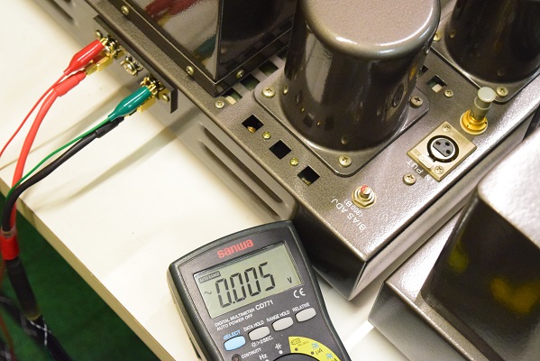 下段左アナログテスターはバイアスの電流値です。シャント抵抗を介して1Vを示します。上段の各値はこの1Vの状態です。下段右は300Bのヒーター電圧です。DC5.27Vで良い値です。
