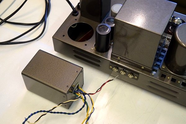 約1時間の試聴でトランスからのうなり音も無く上々です。まだ段ボールとガムテープで固定していますが、最後には左側に置いてあるこちらで製作した奇麗なケースに入れて完成です。