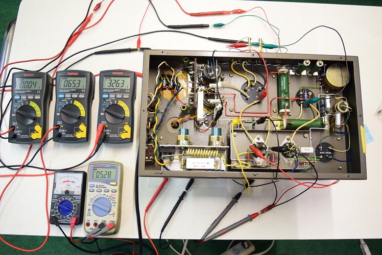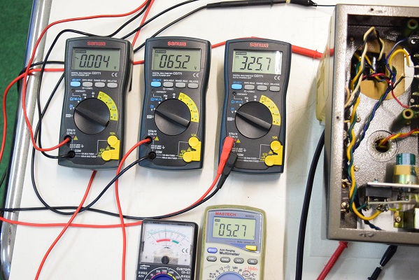 左テスターは高圧のプレート電圧です。少し低めですが良好です。中央のテスターは出力管のヒーター電圧です。こちらも少し低めです。右の白いテスターは高圧B2です。良い値です。