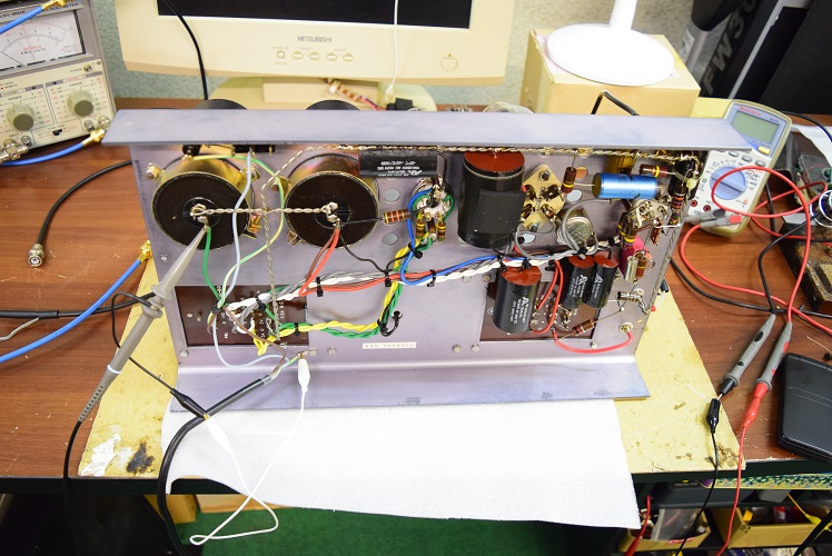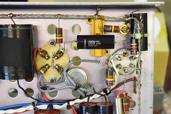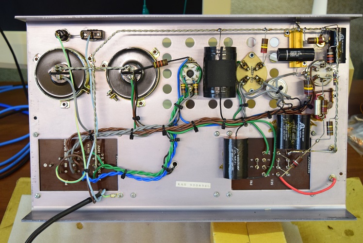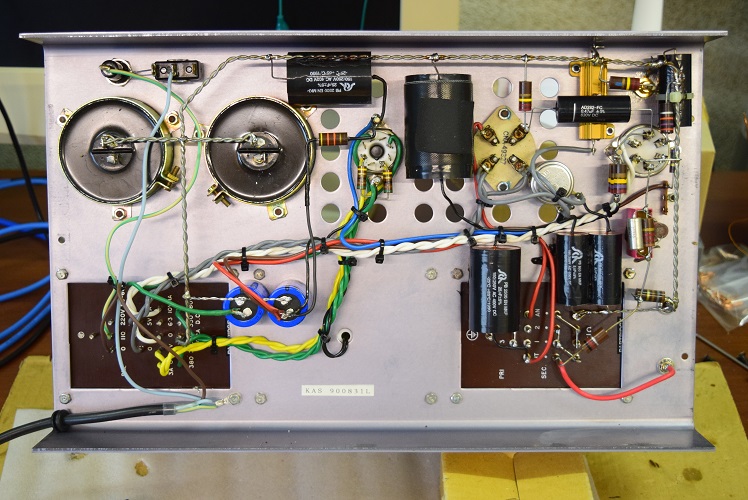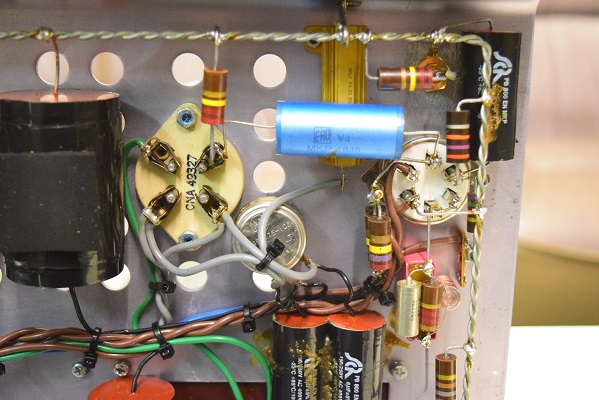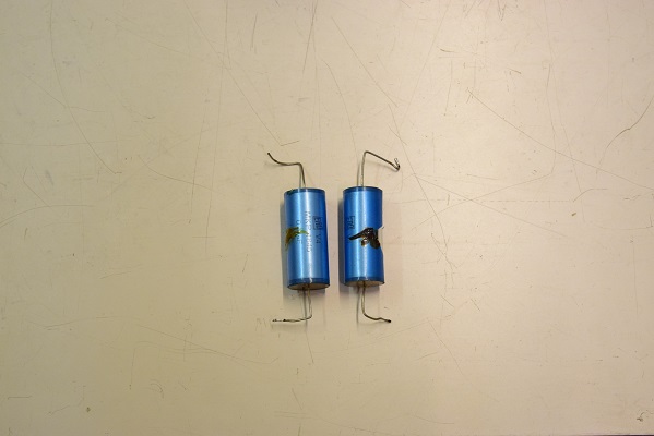 右上の青いカップリングコンデンサーを、当工房で最近よく使うUSA製の黒いコンデンサーに交換しました。