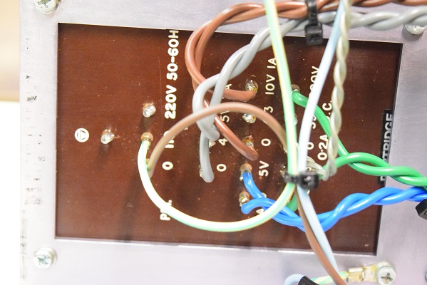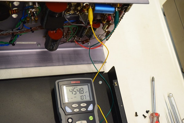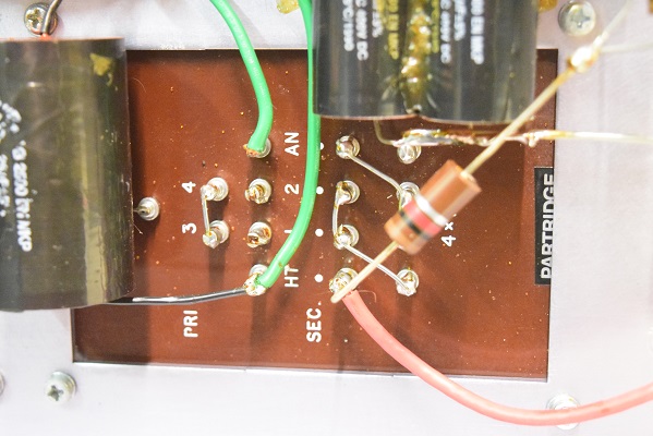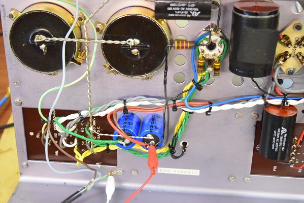 電源回路の大きなフィルムコンデンサーの配線を外し、新規に追加した電解コンデンサー100uF/500V 2本に繋ぎ換えています。