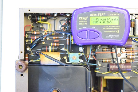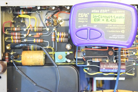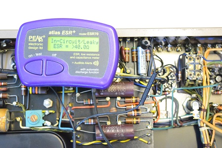 初段管カソードバイパスコンです。リークとESRも表示の最大値40Ωを越して全く機能していません。